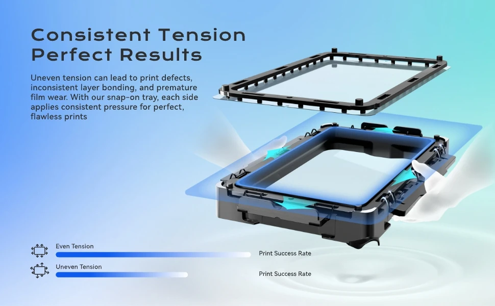 Uneven tension can lead to print defects, inconsistent layer bonding, and premature film wear. With our snap-on tray, each side applies consistent pressure for perfect, flawless prints