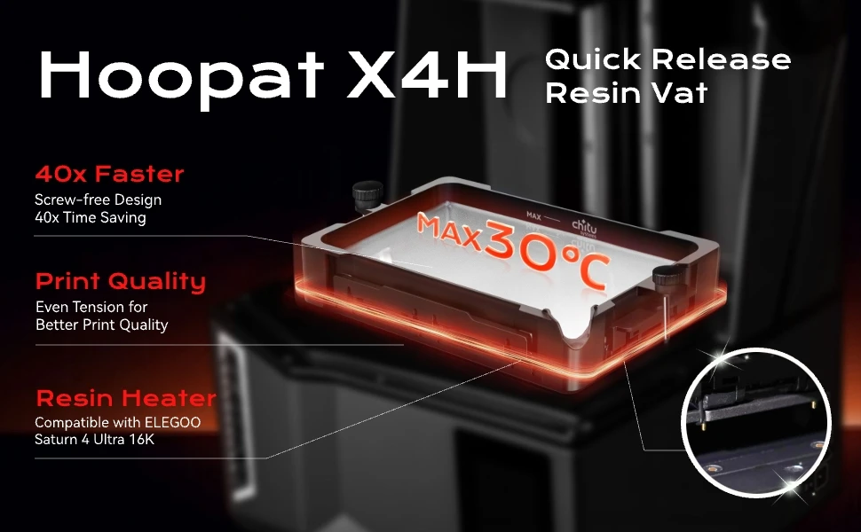 The Chitu Hoopat Quick Release Resin Vat is a durable, easy-to-use replacement vat designed for X3, X4, and X5 models. Compatible with Elegoo Saturn 3/3 Ultra/4/4 Ultra and Anycubic M5s resin printers.